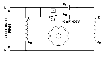 2. What is the name of single phase motor as shown below?जैसा कि नीचे दिखाया गया है सिंगल फेज मोटर का क्या नाम है? [Bharat Skill QB] (A) Permanent capacitor motor स्थायी संधारित्र मोटर (B) Induction start capacitor run motor इंडक्शन स्टार्ट कैपेसिटर रन मोटर (C) Capacitor start capacitor run motor कैपेसिटर स्टार्ट कैपेसिटर रन मोटर (D) Capacitor start induction run motor कैपेसिटर स्टार्ट इंडक्शन रन मोटरANSWER - AShow Answer