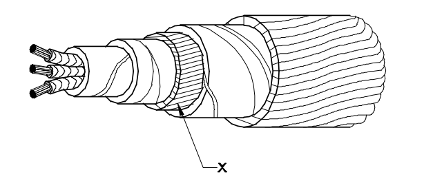 19. What is the name of the part marked "X" in UG cables?इस भूमिगत केबल में "X" से इंगित भाग का नाम बताइए| [Bharat Skill Qb] (A) Serving सर्विंग (B) Bedding बेडिंग (C) Armouring आर्मरिंग (D) Lead sheath लेड शीथANSWER - DShow Answer