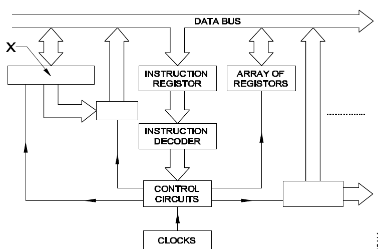 11. What is the name of the block marked as ʹxʹ in the microprocessor shown in the figure?चित्र में दिखाए गए माइक्रोप्रोसेसर में ʹxʹ से चिह्नित ब्लॉक का नाम क्या है? (A) ALU (B) Memory मेमोरी (C) Accumulator एकुम्लेटर (D) Program counter प्रोग्राम काउंटरANSWER - CShow Answer