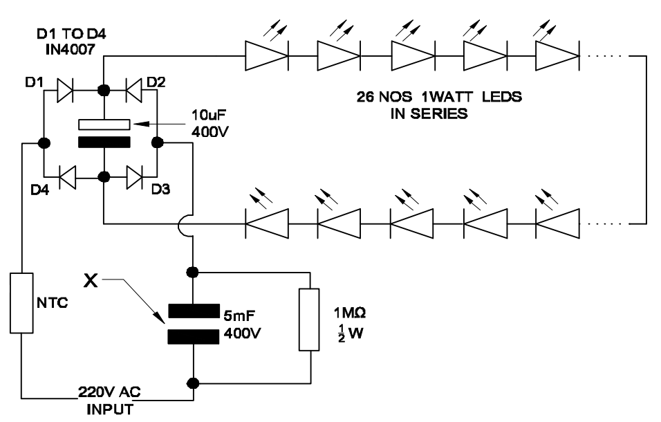 7. What is the name of the component marked "x" in the LED circuit?LED सर्किट में "x" के रूप में चिह्नित घटक का नाम क्या है? (A) SMD stack SMD स्टैक (B) PTC component PTC घटक (C) Non polar capacitor गैर ध्रुवीय संधारित्र (D) Electrolytic capacitor इलेक्ट्रोलाइटकि संधारित्रANSWER - CShow Answer