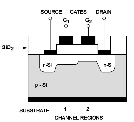 2. Which type of MOSFET construction is shown in the figure?चित्र में किस प्रकार का MOSFET निर्माण दर्शाया गया है? (A) IGBT आईजीबीटी (B) Dual-gate MOSFET ड्यूल गेट MOSFET (C) Depletion type MOSFET डिप्लीशन टाइप MOSFET (D) Enhancement type MOSFET एन्हेंस्मेंट टाइप MOSFETANSWER - BShow Answer