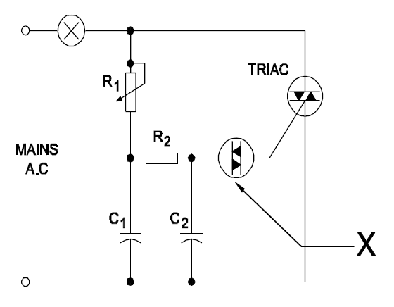 29. What is the name of the component marked "x" in the TRIAC triggering circuit? TRIAC ट्रिगर सर्किट मे "x" के रूप मे चिह्नित घटक का नाम क्या है? (A) SCR (B) UJT (C) FET (D) DIACANSWER - DShow Answer