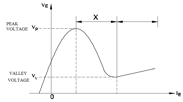 28. What is the name of the region marked as ʹXʹ on the UJT characteristics curve shown in the figure? चित्र में दिखाए गए UJT विशेषता वक्र पर ʹXʹ से चिह्नित क्षेत्र का नाम क्या है? (A) Saturation region सेचुरेशन क्षेत्र (B) Peak current region पीक करंट क्षेत्र (C) Valley current region वेली करंट क्षेत्र (D) Negative resistance region नकारात्मक प्रतिरोध क्षेत्रANSWER - DShow Answer