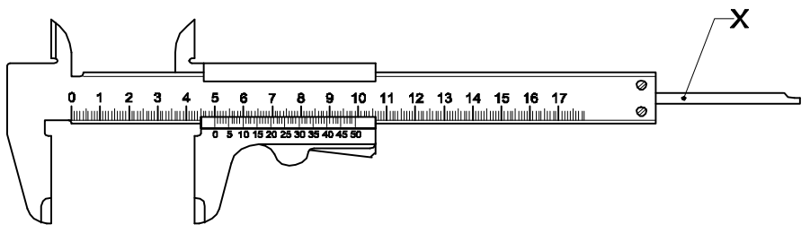 49. What is the name of the part marked as ʹXʹ in vernier caliper shown in the figure?चित्र में दिखाए गए वर्नियर कैलिपर में ʹXʹ से चिह्नित भाग का नाम क्या है? [Bharat Skill QB] (A) Beam बीम (B) Fixed bar फिक्स्ड बार (C) Depth bar डेप्थ बार (D) Thumb lever थंब लीवरANSWER - CShow Answer