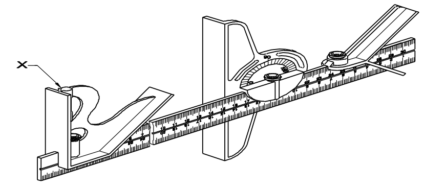 100. What is the name of the part marked as "X" in combination set?संयोजन सेट (कॉम्बिनेशन सेट) में "X" के रूप में चिह्नित भाग का नाम क्या है? [Bharat Skill QB] (A) Rule रूल (B) Scriber स्क्राइबर (C) Clamp nut क्लैंप नट (D) Spirit level स्पिरिट लेवलANSWER - BShow Answer