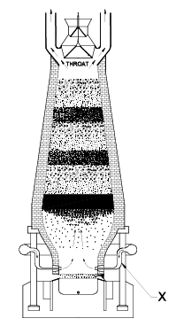 32. What is the name of the part marked as ʹXʹ shown in the figure?चित्र में दिखाए गए ʹXʹ से चिह्नित भाग का नाम क्या है? [Bharat Skill QB] (A) Tuyeres टुयेर्स (B) Molten slag मोल्टन स्लैग (C) Molten iron मोल्टन आयरन (D) Tapping hole टैपिंग होलANSWER - AShow Answer