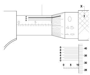 34. What is the name of the part marked "X" in vernier micrometer?वर्नियर माइक्रोमीटर में "X" के रूप में चिह्नित भाग का नाम क्या है? [Bharat Skill QB] (A) Anvil एनविल (B) Barrel बैरल (C) Thimble थिम्ब्ल (D) Ratchet stop रैचट स्टॉपANSWER - CShow Answer