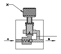 46. What is the name of the part marked as "X" in one way flow control valve?एक तरह से प्रवाह नियंत्रण वाल्व में "X" के रूप में चिह्नित भाग का नाम क्या है? [Bharat Skill QB] (A) Throttling screw थ्रॉटलिंग स्क्रू (B) Notch नोच (C) Opening of spring ball स्प्रिंग बॉल की ओपनिंग (D) Valve set वाल्व सेटANSWER - AShow Answer