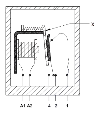 87. What is the name of the part marked as ʹxʹ shown in the figure?चित्र में दिखाए गए 'x' से चिह्नित भाग का नाम क्या है? [NCVT Exam 24] (A) Armature आर्मेचर (B) Return spring रिटर्न स्प्रिंग (C) Contact terminal टर्मिनल से संपर्क करें (D) Coil core कुंडल कोरANSWER - AShow Answer