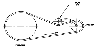 10. What is the name of part marked "X" in the belt drive?बेल्ट ड्राईव में "X" के रूप से चिन्हित भाग का नाम क्या है? [Bharat Skill QB] (A) Step pulley स्टेप पुल्ली (B) Driver pulley ड्राईवर पुल्ली (C) Driven pulley ड्रिवन पुल्ली (D) Jockey pulley जॉकी पुल्लीANSWER - DShow Answer