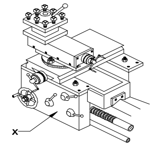 34. What is the name of part marked as "X" in center lathe?केंद्र खराद में "X" के रूप में चिह्नित भाग का नाम क्या है? [Bharat Skill QB] (A) Apron एप्रन (B) Saddle सैडल (C) Gross slide क्रास स्लाइड (D) Compound rest कम्पाउंड स्लाइडANSWER - AShow Answer
