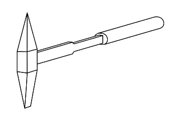38. What is the name of the hand tool shown in the figure?चित्र में दिखाए गए हैन्ड टूल का नाम क्या है? [NCVT Exam 25] (A) Chipping hammer चिपिंग हैमर (B) Straight pein hammer स्ट्रैट पीन हैमर (C) Ball-pein hammer बॉल - पीन हैमर (D) Cross-pein hammer क्रॉस - पीन हैमरANSWER - AShow Answer